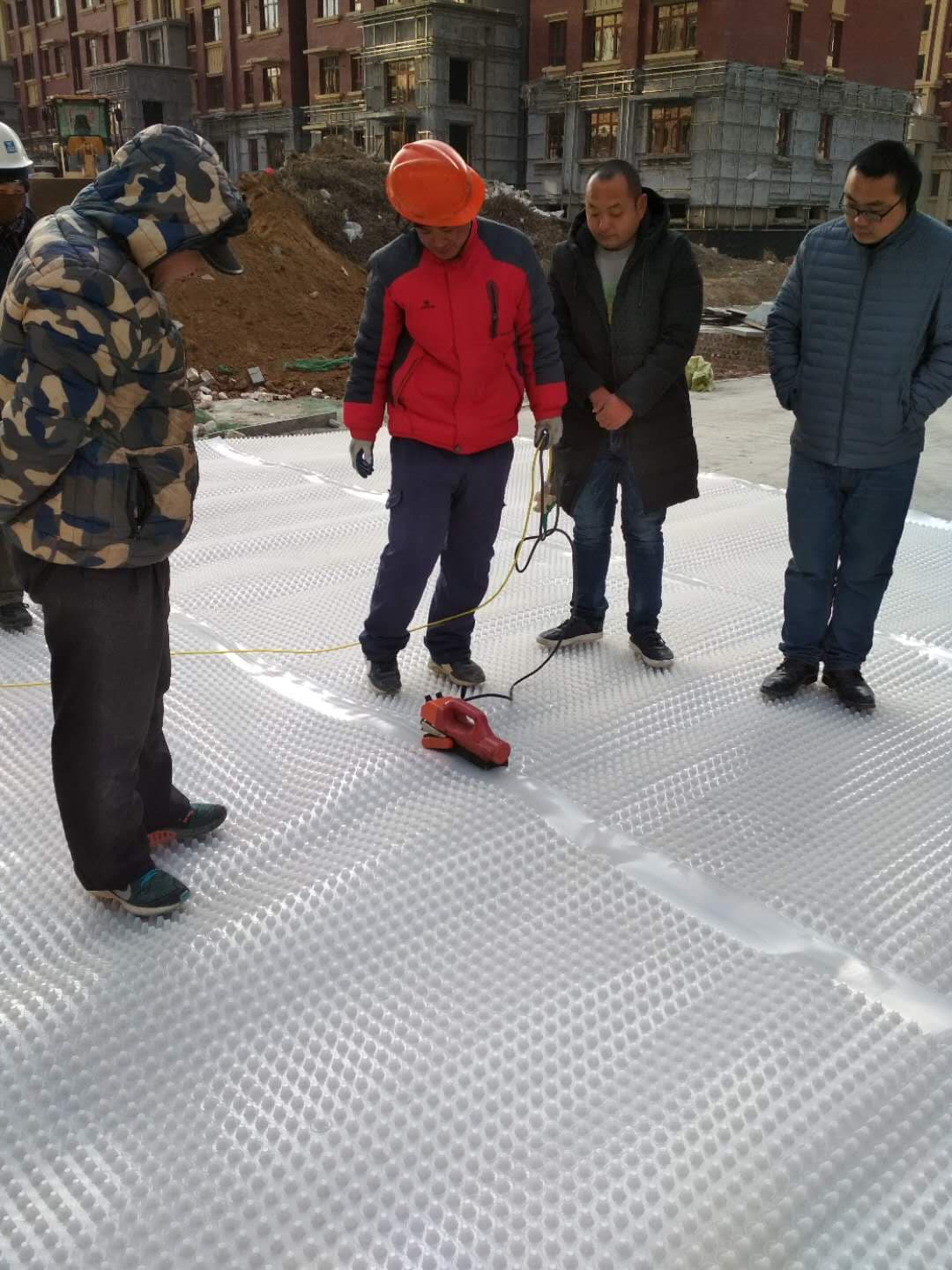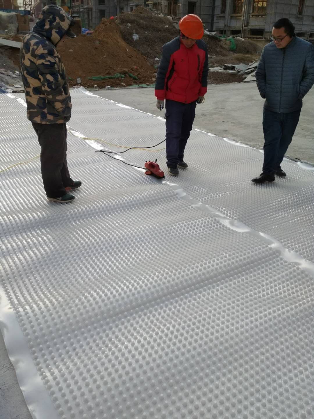 通州區(qū)客戶定制白色全新料排水板 型號是2公分 抗壓強度很高 質(zhì)量好 人上去一點沒問題 此材料是全新料生產(chǎn)的 它比普通國產(chǎn)的質(zhì)量好很多 色澤鮮亮 光滑 下面是工人們在現(xiàn)場施工圖 操作簡單 ,公司的施工技術(shù)人員劉師傅親臨現(xiàn)場指導(dǎo)